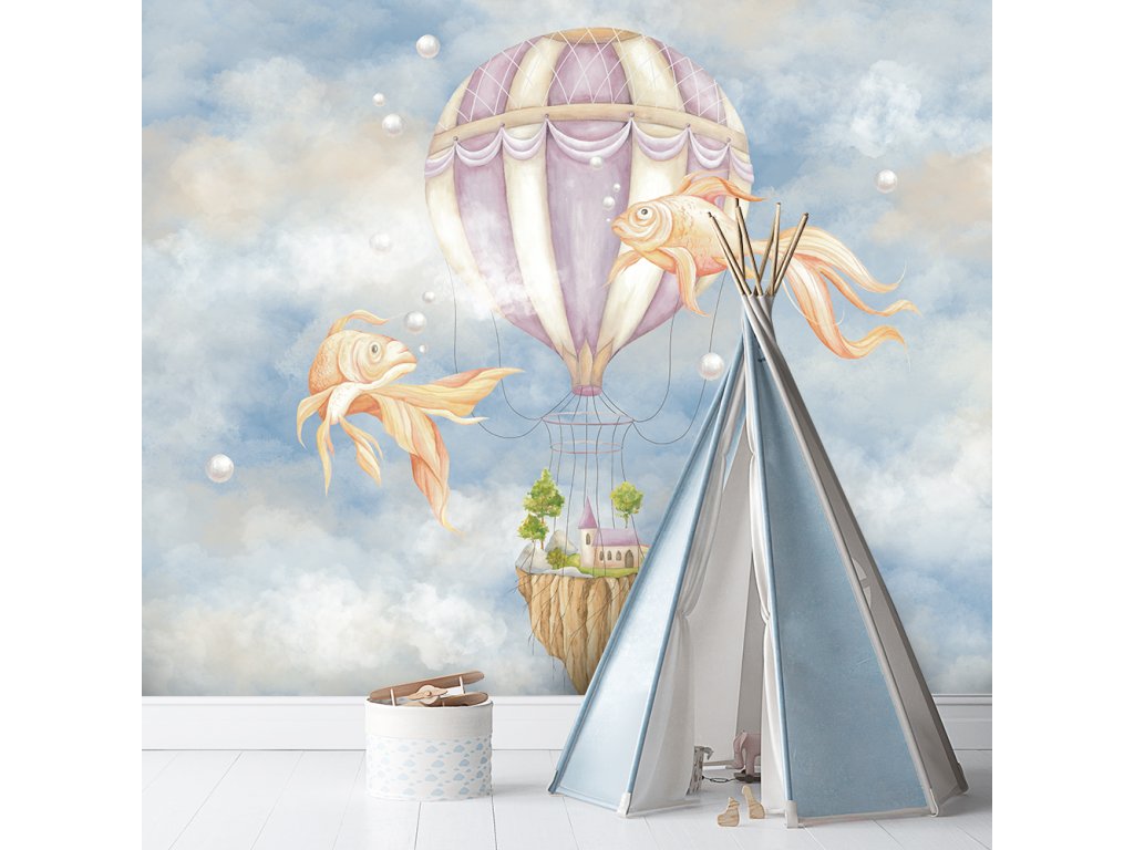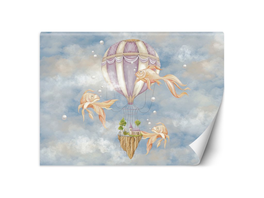 Fototapeta Horkovzdušný balón, dům a ryby na modré obloze