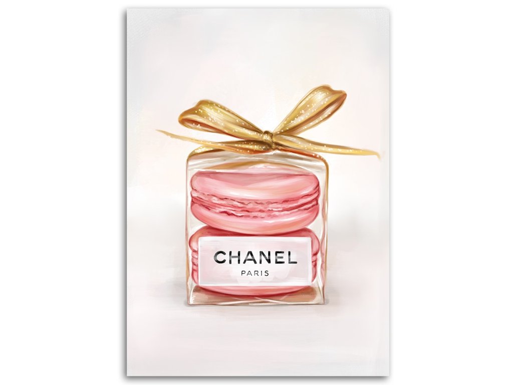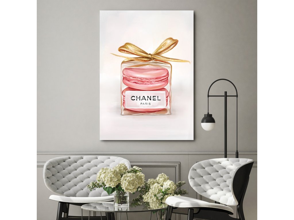 Obraz na plátně Flakon na parfém Chanel a makronky
